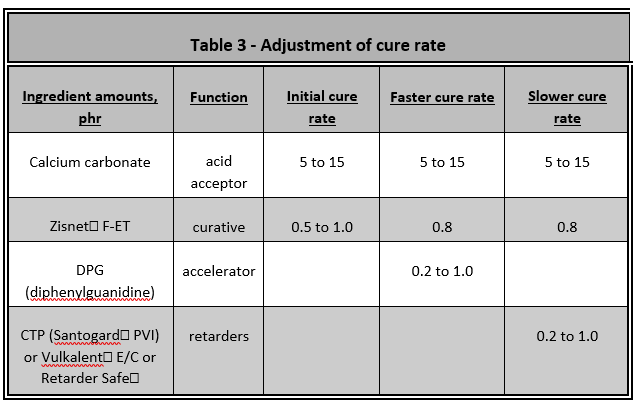 A viable lead and ETU free cure system for Hydrin elastomers is Zisnet F-ET a triazine. The cure rate is readily adjustable. Table 3 shows how to adjust the cure rate of a triazine (Zisnet F-ET) cure package by varying accelerators and retarders.